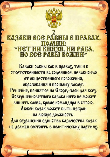 2. КАЗАКИ ВСЕ РАВНЫ В СВОИХ ПРАВАХ. ПОМНИ: "НЕТ НИ КНЯЗЯ, НИ РАБА, НО ВСЕ РАБЫ БОЖИИ".