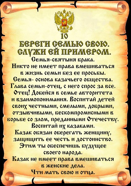 Семья - святыня брака. Никто не имеет права вмешиваться в жизнь семьи ·без её просьбы. Семья - основа казачьего общества. Глава семьи - отец, с него спрос за всё.