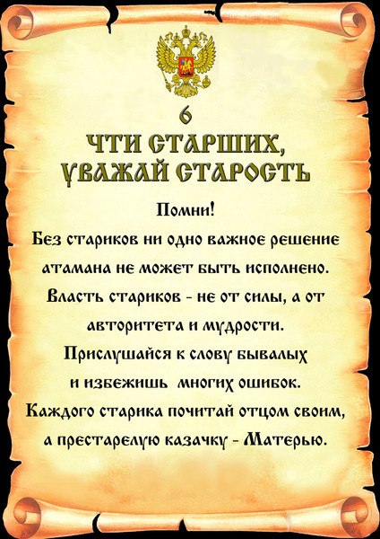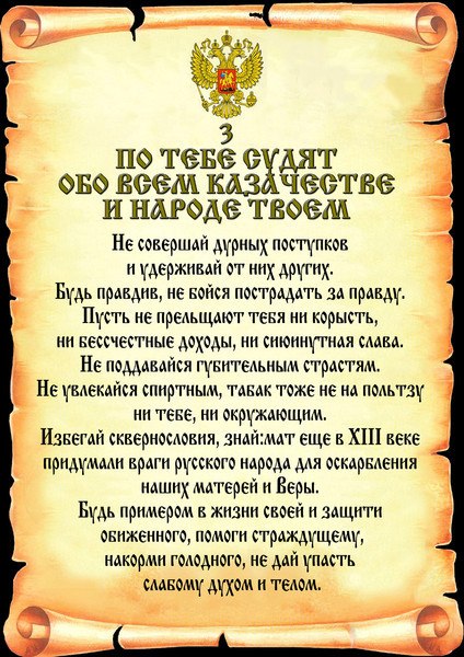 Береги честь смолоду. Достоинство сохраняй в любой обстановке. Имей волю признать свою неправоту. Если надо, побори сам себя. Не завидуй другим и не держи зла в сердце своём. Не будь гордецом; и в мыслях не допуская, что ты выше других казаков. Никого не поучай свысока, посмотри сначала на себя. Будь доброжелателен,