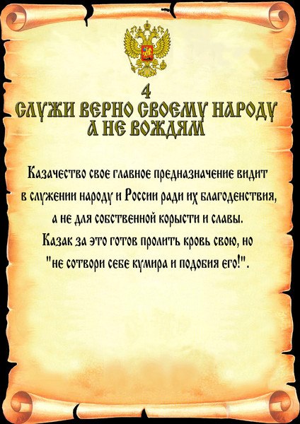 Каждый вступающий в любое казачье объединение или сознающий себя казаком должен следовать главным принципам казачьей нравственности, которые в основе своей имеют нормы христианской морали и состоят в следующем: