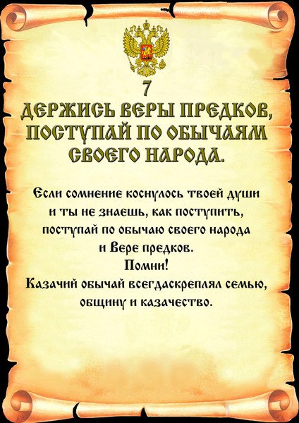 Если сомнение коснулось твоей души, и ты не знаешь, как постуупить, - поступай по обычаю своего народа и Вере предков. Помни! Казачий обычай всегда скреплял семью, общину и всё Казачество.