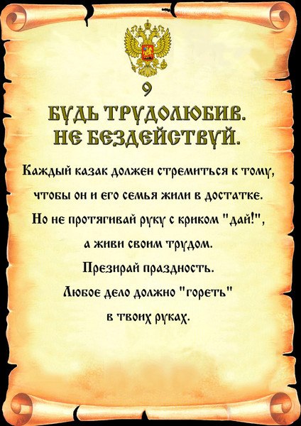 Каждый казак должен стремиться к тому, чтобы он и его семья жили в ДQстатке, но не протягивай руку криком "Дай!". Живи своим трудом. Презирай праздность. Любое дело должно "гореть" в твоих руках.