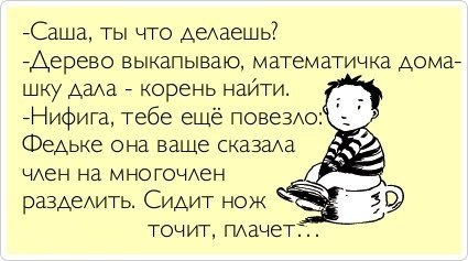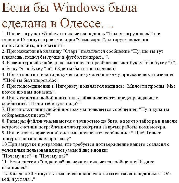 На передних сидениях едут две бабушки. Маршрутка почти полная. На остановке заходит парень. Передает водителю 10 рублей за проезд и получает сдачу 1 рубль. Рубль из рук выскальзывает и падает под сиденья бабушкам. Парень наклоняется, пытается найти сдачу и, неожиданно, пукает. В маршрутке - тихий смех, хихиканье. А одна из бабушек говорит другой: ”И стоило из-за рубля так жопу рвать!” Маршрутка взрывается от хохота. Парень становится пунцовым и просит остановить маршрутку. Через минуту в маршрутку заходит солидная дама. Маршрутка продолжает смеяться. Дама начинает себя нервно осматривать. Может, это над ней смеются? Тут бабушки, покатываясь от смеха, начинают рассказывать даме историю с рублем. Дама тоже начинает смеяться и тут у нее из носа вылетает сопля и попадает на бабушек... Дама просит остановить маршрутку. Едем дальше, покатываясь от смеха. Водитель тоже вместе со всеми хохочет, достает сигареты, закуривает, приоткрывает люк над головой. Выпуская дым в люк, обращается к бабушкам: ”Вам под люком (падлюкам) не дует?” Салон взрывается от нового приступа смеха. Водитель, поняв, что он сказал, вываливается из кабины, пританцовывая и угорает. Эта же маршрутка 20 минут спустя. Маршрутка с конечной остановкой ”поселок Сахарный”. Все сели, места заняты... Водила завел машину... Тут дверь открывает бабка... И тут же спрашивает у водилы: ”Милок, у тебя конец Сахарный?”. По маршрутке прошло легкое хихиканье... Водила не долго думая ответил: «Не знаю, не пробовал!”. По маршрутке пошел открытый ржач! Бабка, осмотрев ястребиным взглядом салон поняла, что свободных мест нету... И протягивая 10р. водиле, сказала: ”Возьми меня стоя!”. Водитель вываливается из кабины в сугроб и трясется в истерическом припадке...
